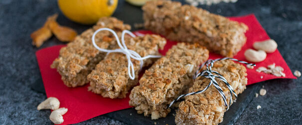 Vor dem Backen können zusätzlich noch halbe Cashewkerne in die Oberfläche gedrückt werden, um die Bars dekorativ zu gestalten.