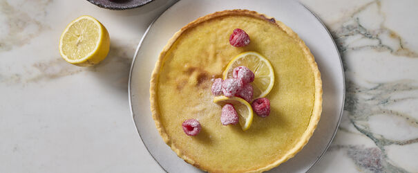 Inzwischen Rhabarber putzen und schälen. Stangen auf die Breite der Tarteform zuschneiden. Saure Sahne, Eier, Zucker und Vanillemark verrühren. Frische Himbeeren verlesen, aufgetaute Beeren gut abtropfen lassen. Mit Rhabarberstangen auf dem vorgebackenen Tarteboden verteilen. Eierguss darüber gießen und Tarte im heißen Ofen bei 180° C weitere 30 bis 35 Minuten fertig backen.