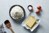 Alle trockenen Zutaten vermengen. Die Mischung auf die Arbeitsfläche geben, eine Mulde in die Mitte drücken, Eier und Kirschwasser hineinfüllen, Butter in Stückchen auf dem Mehlrand verteilen und alles per Hand zu einem glatte